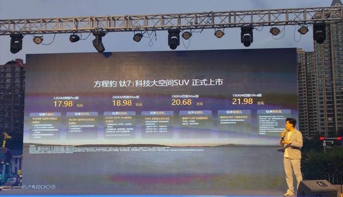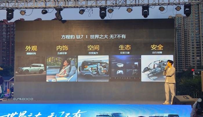 在万众期待中,产品讲解环节到来。专业讲解人员上台,详细阐述方程豹钛 7 的非凡科技与舒适配置。他先介绍动力系统,其搭载的先进动力总成,既能提供强劲动力满足越野需求,又兼顾燃油经济性,日常家用无压力。接着重点介绍科技配置,钛 7 拥有科技舒适的五感座舱:视觉上,高清中控大屏、精致内饰材质营造出科技感与豪华感兼具的氛围;触觉上,真皮座椅细腻、多功能方向盘操控精准,带来愉悦体验;听觉上,高级音响系统还原清晰悦耳音乐;嗅觉上,车内空气净化系统时刻保持空气清新;体感上,良好的底盘调校和座椅设计带来舒适驾乘感受,全方位为驾乘者营造舒适愉悦体验。