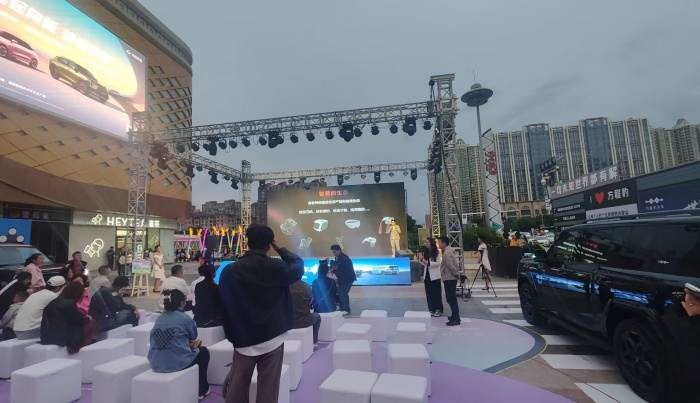 9 月 21 日,呼和浩特市回民区万达广场室外 2 号门被蓝色灯光与热烈氛围环绕,“世界之大 无 7 不有” 方程豹钛 7 巡回上市品鉴会在此盛大开启。傍晚,夕阳余晖为盛会添了浪漫色彩,众多嘉宾、媒体及汽车爱好者早早齐聚,满心期待这款科技大空间 SUV 的硬核魅力绽放。