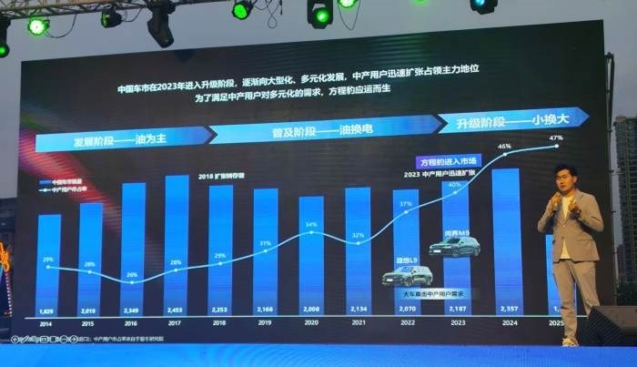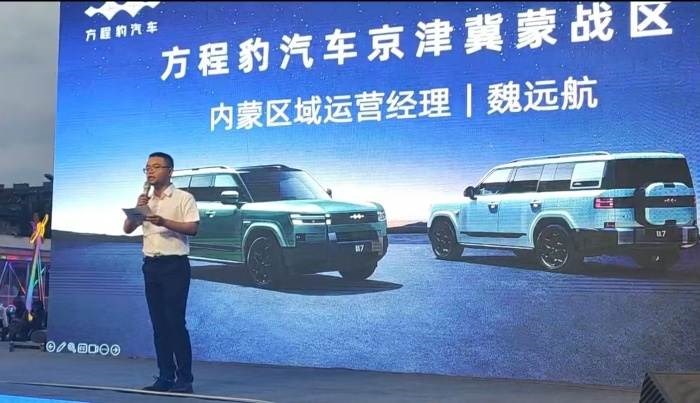 首先,方程豹汽车京津冀蒙战区内蒙古区域运营经理魏远航上台致辞。他表示,方程豹始终关注市场需求与用户体验,钛 7 的推出,是品牌顺应中国车市向大型化、多元化发展趋势,满足中产用户多元化需求的重要举措。内蒙古地区有着独特的地理环境与用车需求,钛 7 兼具硬派性能与家用舒适的特点,非常契合当地消费者对高品质出行的追求。他期待钛 7 能为内蒙古消费者带来全新的用车体验,也感谢大家对方程豹品牌的支持与关注。