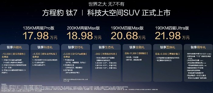 此次方程豹钛 7 共推出四款车型,售价区间为 17.98 万元 - 21.98 万元。这样的价格在 5 米级的硬派 SUV 市场中具备极高的性价比。尤其是高配版车型,以 21.98 万元的顶配价格,便能拥有顶级的智能驾驶辅助硬件、丰富的舒适性配置以及强劲的动力系统,相较同级别、同尺寸且配置相当的竞品车型,价格要低出不少 。对比同级别竞争对手,钛 7 在配置相当甚至更优的情况下,价格更具优势,为消费者提供了一个极具吸引力的选择。